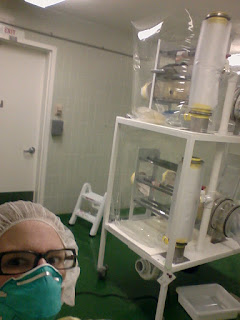 For five months now, we've been eagerly awaiting our germ-free isolators, which are giant plastic bubbles that can be sterilized (remember my carpet bombing metaphor!) and be used to house germ-free mice. It's a simple concept with a shockingly complex execution. The isolators need to be built before anything, and they have to be built correctly to ensure that the air flow in and out of them is controlled and filtered. Then they're sterilized chemically. The result, if you've done it right, is an inflated bubble of filtered air, with contents that is completely devoid of any and all bacteria, viruses, or fungi, making it a germophobe's wet dream. Once sterilized, the isolators have to be treated very carefully to maintain sterility; all items are moved in and out of the isolators using a port that mimics a space station air lock, and all items must either be sterilized chemically or mechanically in an autoclave. All work is done using a large set of heavy white astronaut gloves. Meanwhile, weekly testing is used to confirm the germ-free status: methods include PCRing mouse feces, swabbing and incubating bacterial plates, and Western blot. If you've never collected mouse feces while wearing astronaut gloves, then you have no idea just how hard this is.