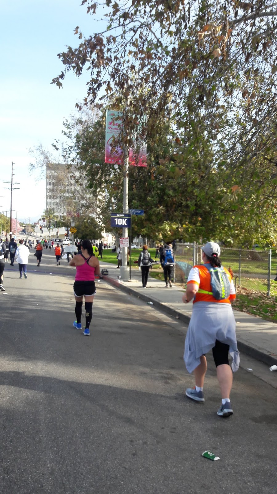 Los Feliz featured a lot of yuppies sipping Americanos on their terraces, staring down at us, some with cowbells to encourage us but more with a sort of pitying look. At mile 8 many runners have reduced speed and are looking like crap.