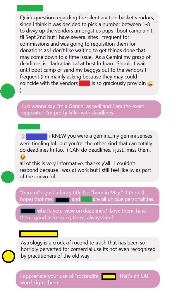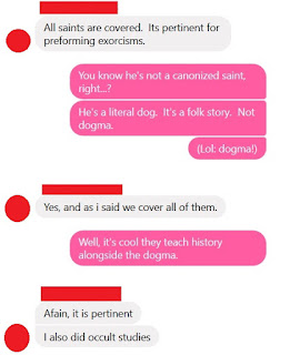In the 2019 LA Pup pack this year there is one member who is interested heavily in what I would call "occult Catholicism." He was raised Catholic like me but I try not to engage him much because his brand of religion sounds like a video game mixed with a peyote trip. He seems to believe in a lot of weird stuff. Not acceptable, talking-snake-giving-a-chick-an-apple weird, but really weird. Like, blood rituals and secret societies and stuff like that. Hoodoo, basically. (I won't get into specifics here as I don't want to give too many personal details, although I will say that he told me his grandmother could bring herself back to life and that he has a suit of armor in the Vatican, both of which strike me as... not very believable.)