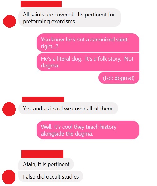 Also, read the room! This was in a group chat with like 10 queer people. Exorcisms are one of those practices that I believe is inherently harmful. When it's not being used as a justification to torture homosexuals and the mentally ill, it's being used in place of actual medical treatment, making it a dangerous exercise.
