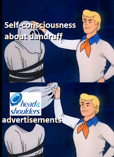 So I guess what I'm trying to say here is, a lot of our concerns about our appearance are not logical, and have been ingrained by advertisers who are playing off of our natural pathos. Advertisers know we want to be liked and know we're self-conscious and paranoid. They are more than willing to play on that paranoid to sell more shampoo (or toothpaste, or petroleum jelly).